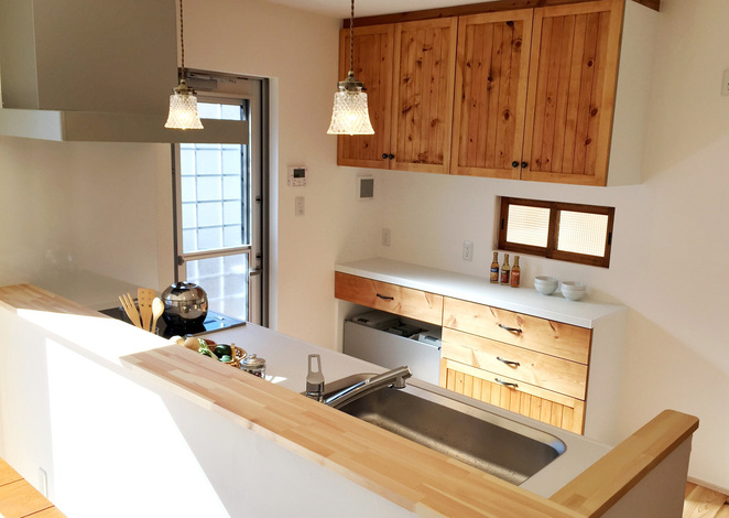 Panasonic製のものをアレンジして造った おしゃれな無垢扉のカップボード は アトラス建設と横浜市のキッチン工房とのコラボ作品 家事室